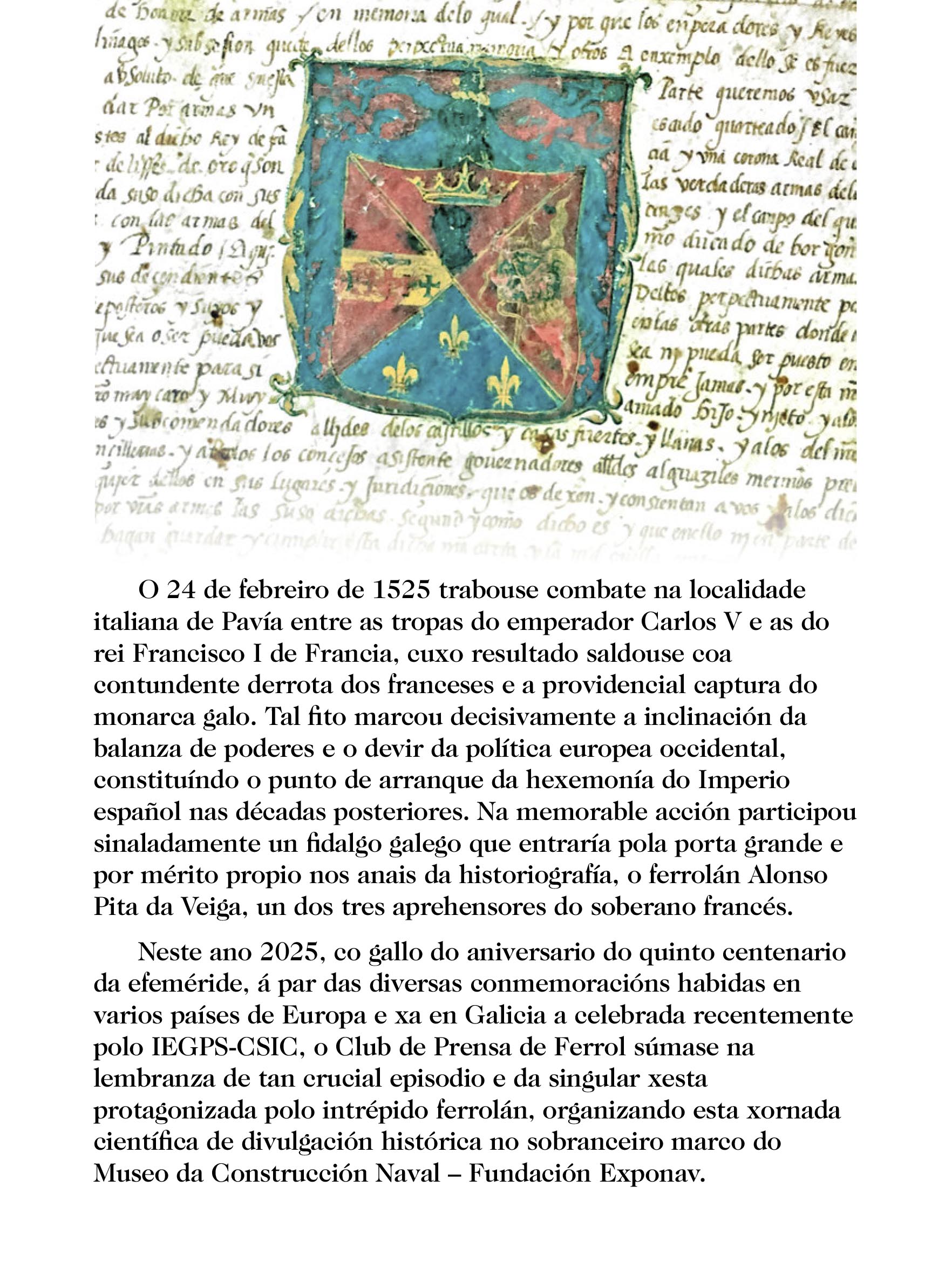 Na memorable acción participou sinaladamente un fidalgo galego que entraría pola porta grande e por mérito propio nos anais da historiografía, o ferrolán Alonso Pita da Veiga, un dos tres aprehensores do soberano francés. Neste ano 2025, co gallo do aniversario do quinto centenario da Batalla de Pavía, á par das diversas conmemoracións habidas en varios países de Europa e xa en Galicia, a celebrada recentemente polo IEGPS-CSIC, o Club de Prensa de Ferrol coa colaboración do Museo de Construcción Naval -Fundación Exponav- súmase na lembranza de tan crucial episodio e da singular xesta protagonizada polo intrépido ferrolán, Alonso Pita da Veiga, organizando esta xornada científica de divulgación histórica no sobranceiro marco do Museo da Construcción Naval - Fundación Exponav.