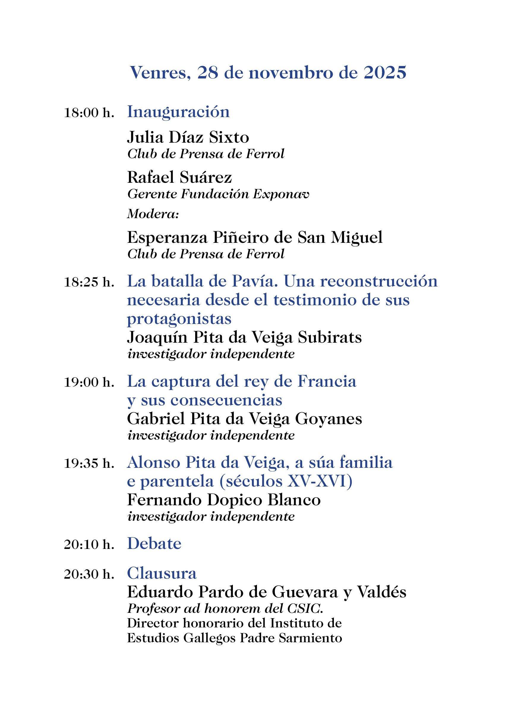 Na mesma e trala inauguración na que participarán a presidenta do Club de Prensa e o xerente do Museo de Construcción Naval - Fundación Exponav, intervirán como relatores Joaquín Pita da Veiga Subirats, que versará sobre “La batalla de Pavía. Una reconstrucción necesaria desde el testimonio de sus protagonistas”; Gabriel Pita da Veiga Goyanes, sobre “La captura del rey de Francia y sus consecuencias”, e Fernando Dopico Blanco, sobre “Alonso Pita da Veiga, a súa familia e parentela (séculos XV-XVI)”. Posteriormente e tras un debate moderado pola historiadora Esperanza Piñeiro de San Miguel, ás 20:30 será clausurada por Eduardo Pardo de Guevara y Valdés, Profesor ad honorem del CSIC, Director honorario del Instituto de Estudios Gallegos Padre Sarmiento.