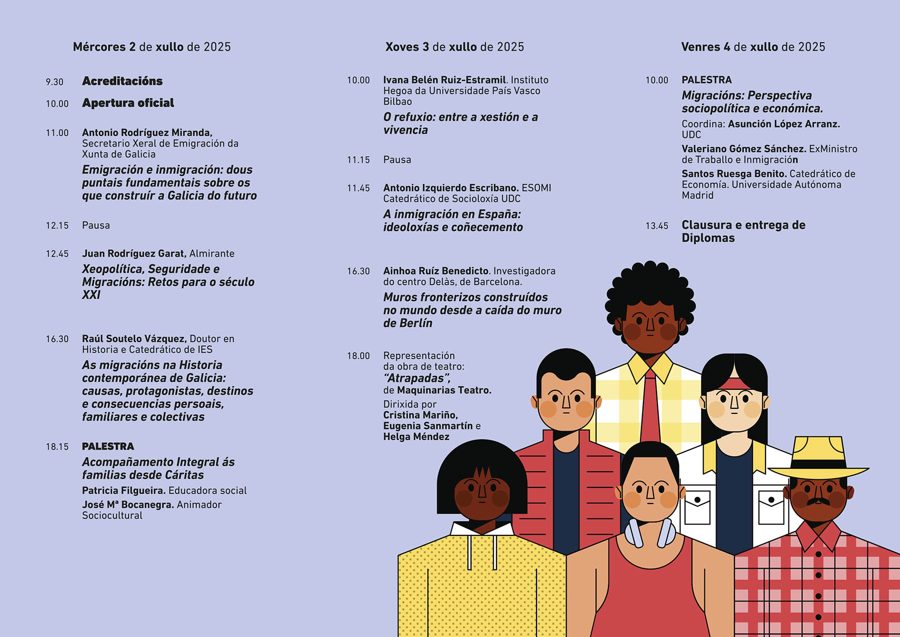 Por último, o venres 4 de xullo, a partires das 10:00 horas, terá lugar unha segunda palestra titulada “Migracións: Perspectiva sociopolítica e económica” na que participarán o exministro de Traballo e Inmigración na novena lexislatura baixo a presidencia de José Luis Rodríguez Zapatero, o economista Valeriano Gómez Sánchez; e o catedrático de Economía Aplicada na Universidad Autónoma de Madrid (UAM), Santos Miguel Ruesga Benito. As persoas interesadas en participar neste curso gratuíto terán que enviar un correo electrónico cos seus datos persoais a este email ou ben chamar ao 661 331 986 antes das 09:30 horas do mércores 2 de xullo.
